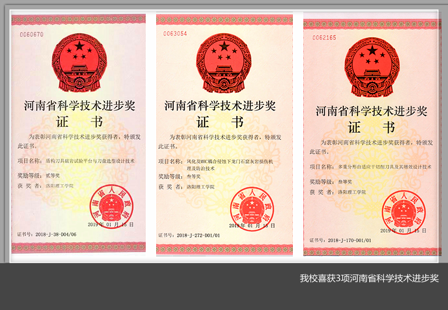 美高梅娱乐场 丁梧秀教授主持完成的《风化及MHC耦合侵蚀下龙门石窟灰岩损伤机理及防治技术》、李彬教授主持完成的《多重分形自适应干切削刀具及其增效设计技术》2项科技成果获河南省科学技术进步三等奖。美高梅娱乐场 机械美高梅娱乐场 王海霞博士参与完成的《盾构刀具破岩试验平台与刀盘选型设计技术》科技成果获河南省科学技术进步二等奖。