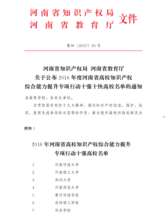 近日,省知识产权局、省教育厅联合印发《关于公布2016年度河南省高校知识产权综合能力提升专项行动十强十快高校名单的通知》(豫知〔2017〕 65号),美高梅娱乐场 名列全省高校第六名。