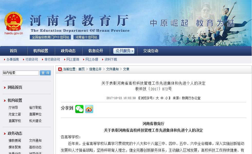 近日,河南省教育厅发布《关于表彰河南省高校科技管理工作先进集体和先进个人的决定》(教科技〔2017〕872号),美高梅娱乐场 科研处获河南省高校科技管理工作先进集体荣誉称号,美高梅娱乐场 刘钧、程广伟、王海霞3位老师被评为河南省高校科技管理工作先进工作者。