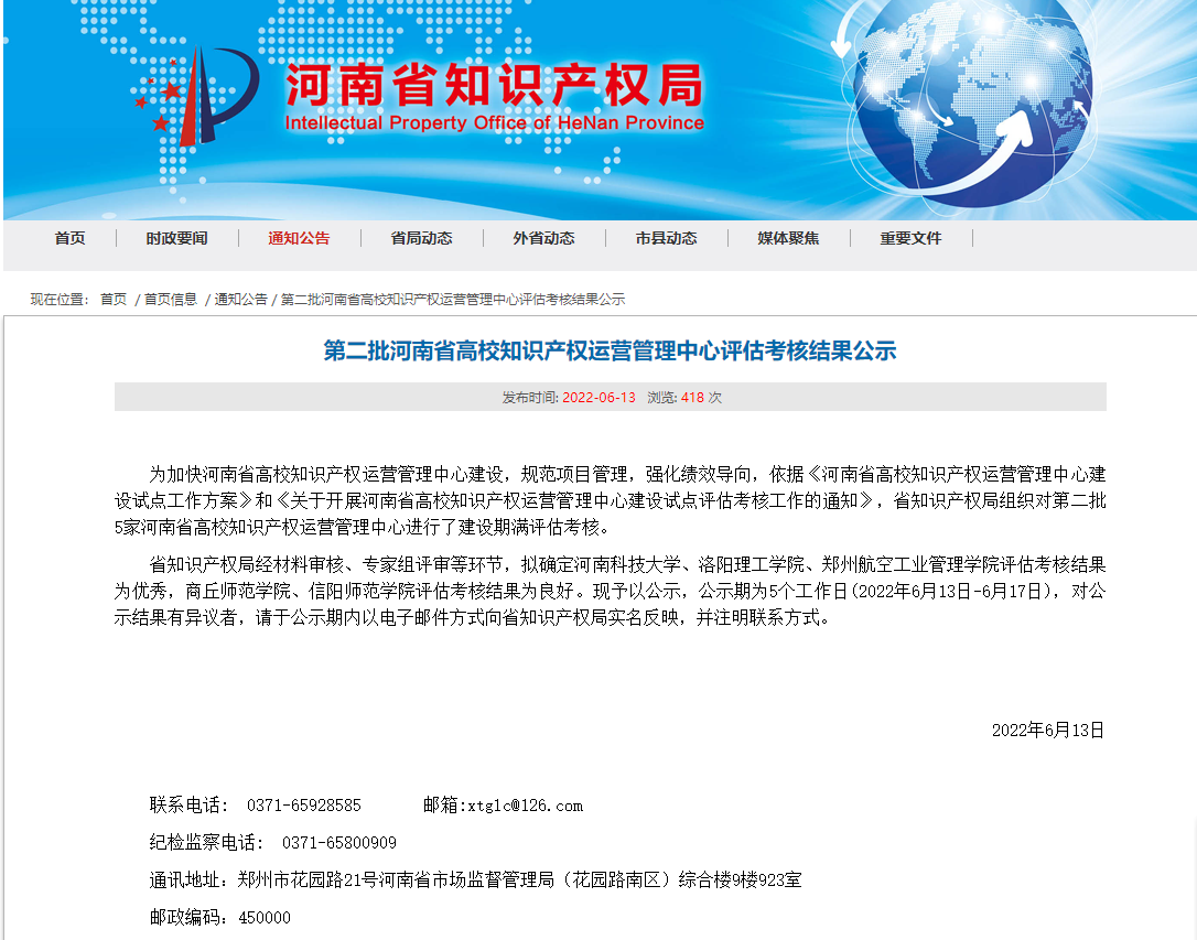 省知识产权局经材料审核、专家组评审等环节,河南科技大学、美高梅娱乐场 、郑州航空工业管理美高梅娱乐场 评估考核结果为优秀,商丘师范美高梅娱乐场 、信阳师范美高梅娱乐场 评估考核结果为良好。