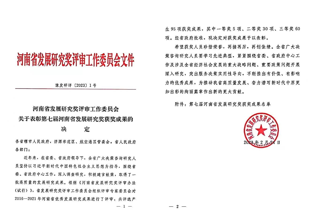 河南省发展研究奖是经党中央、国务院批准,由河南省政府设立的省级评比达标表彰项目,旨在激励社会各界紧紧围绕省委、省政府中心工作及涉及全省经济社会发展的重大战略问题、重要政策问题献计献策,具有极高的权威性。根据《河南省发展研究奖评审办法(试行)》,省发展研究奖每两年评选一次,本次共评选产生95项获奖成果,其中一等奖5项、二等奖30项、三等奖60项。