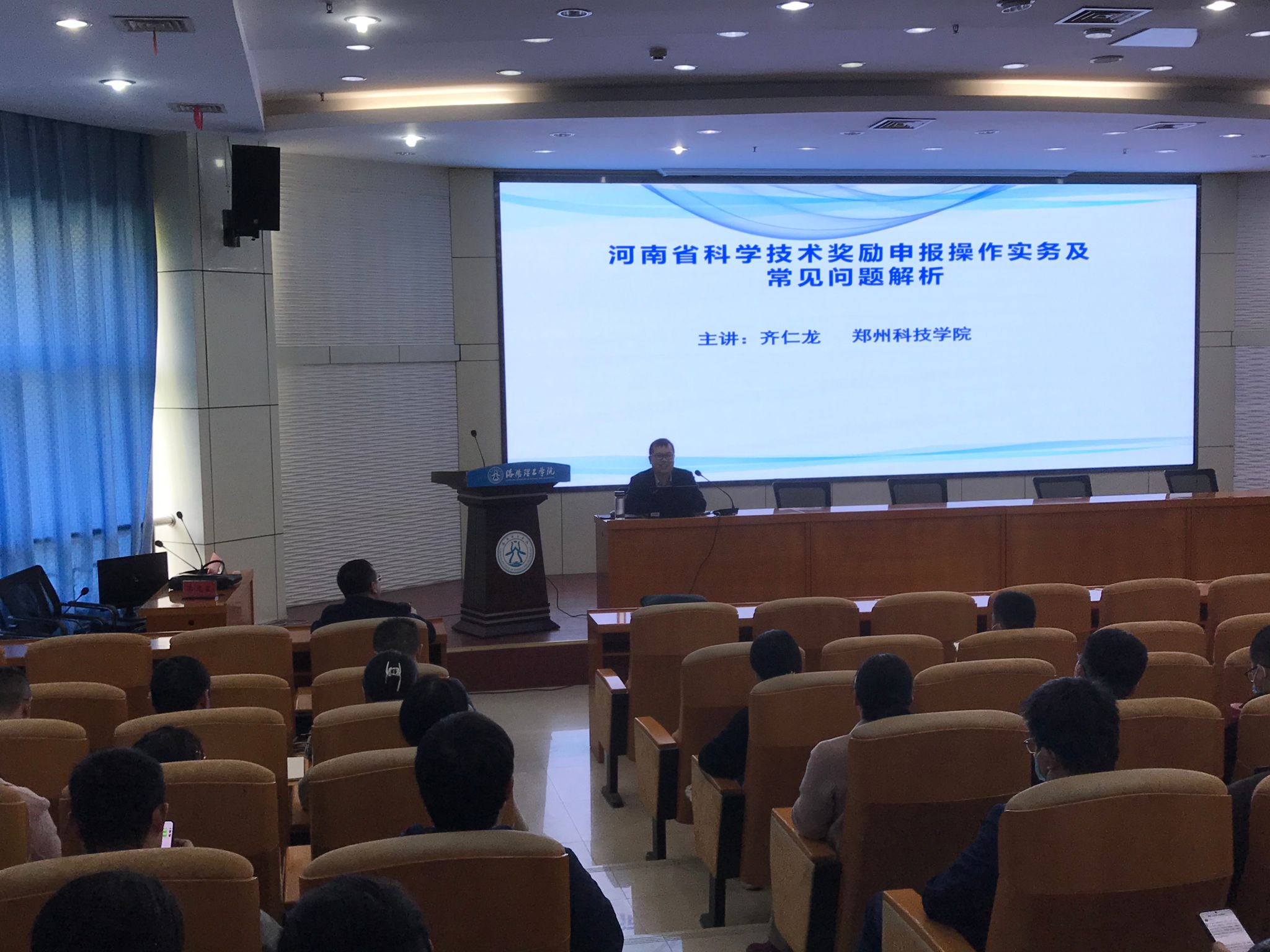齐仁龙教授作《河南省科学技术奖励申报操作实务及常见问题解析》专题报告,报告会在王城校区办公楼报告厅召开,美高梅娱乐场