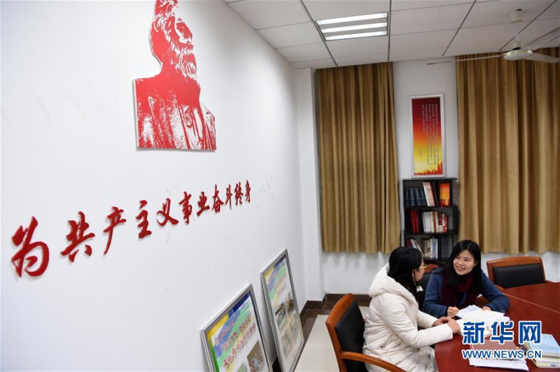 在南京航空航天大学大学生思想引领理论研究工作室,思政理论课教师何畏(右)与学生交流(1月11日摄)。她开设的《世界社会主义五百年》等公开课深受学生欢迎。 (新华社记者 马宁/摄)