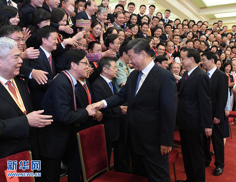 9月10日,党和国家领导人习近平、李克强、王沪宁等在北京人民大会堂会见庆祝2019年教师节暨全国教育系统先进集体和先进个人表彰大会受表彰代表。(新华社记者 申宏/摄)