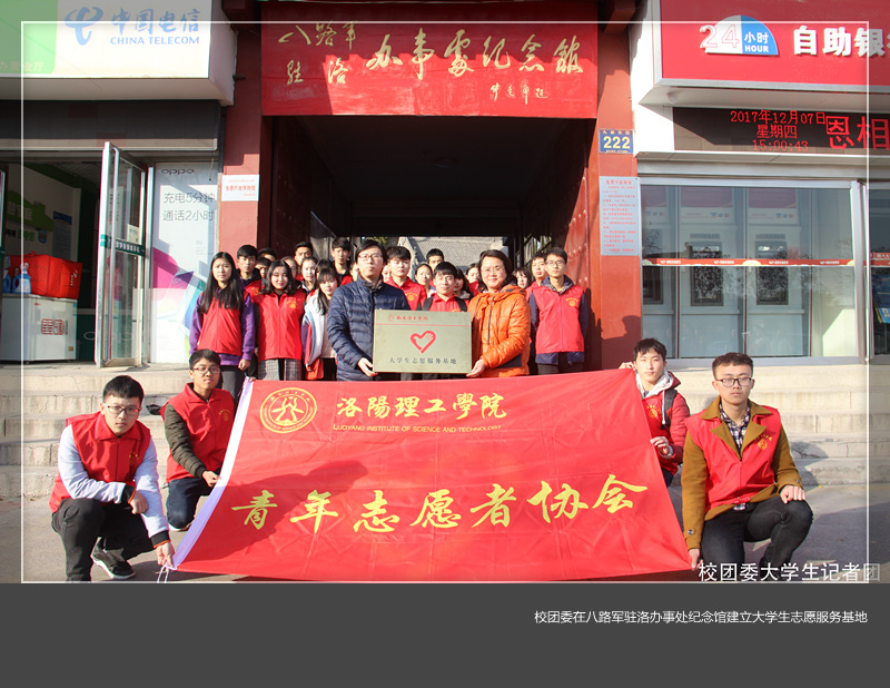 12月7日,美高梅娱乐场 团委在八路军驻洛办事处纪念馆建立大学生志愿服务基地。校团委相关老师和洛八办纪念馆保卫科科长吴桂萍女士,以及校青协的志愿者们参加了挂牌仪式。
