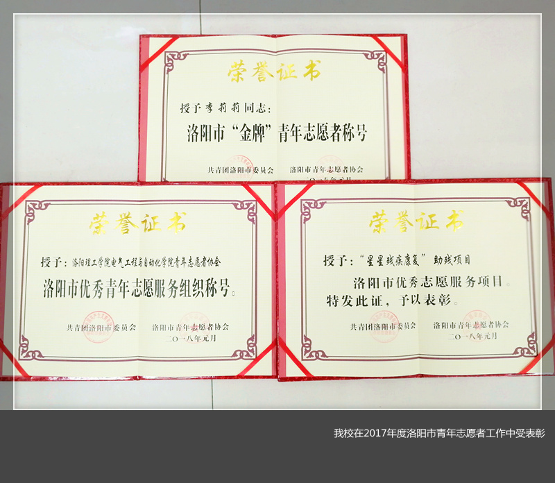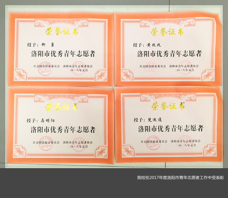 近日,共青团洛阳市委、洛阳市青年志愿者协会表彰了2017年度洛阳市青年志愿者工作优秀个人和组织。