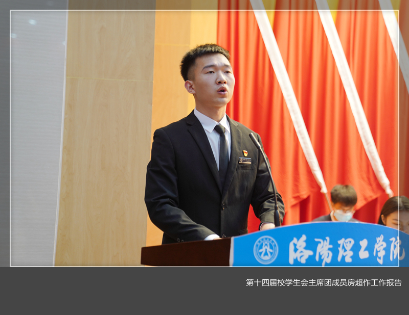 第十四届校学生会主席团成员房超代表第十四届学生委员会作了题为《矢志拼搏奋斗 勇担时代使命 为建设特色鲜明的高水平应用型大学贡献青春力量》的工作报告。