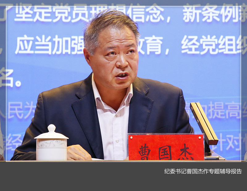 纪委书记曹国杰在会上作了题为《为全面从严治党提供铁的纪律保障——<中国共产党纪律处分条例>解读》的专题辅导报告。曹国杰在报告中详细回顾了党的纪律条例出台修订的历史沿革,他强调指出,党的十九大开局之年再修《条例》,本身就体现出党中央从严管党治党的坚定决心和不变立场。此次新修订的《条例》共142条,与原《条例》相比新增11条,修改65条,整合了2条,他分别从《条例》的总则、政治纪律、组织纪律、廉洁纪律、群众纪律、工作纪律和生活纪律等七个方面,对照修订前的《条例》进行了深入解读,对《条例》中新增内容和新的变化进行了着重强调和详细阐释。曹国杰强调指出,党中央不断加强党的纪律建设,就是要让制度“长牙”,让纪律“带电”,越往后执纪越严,是全面从严治党向纵深推进的重要标志,他希望全体党员一定要认清形势,认真学习,要习惯在受监督和约束的环境中学习、工作和生活,自觉遵守党规党纪,共同努力、一起营造风清气正的教育政治生态。