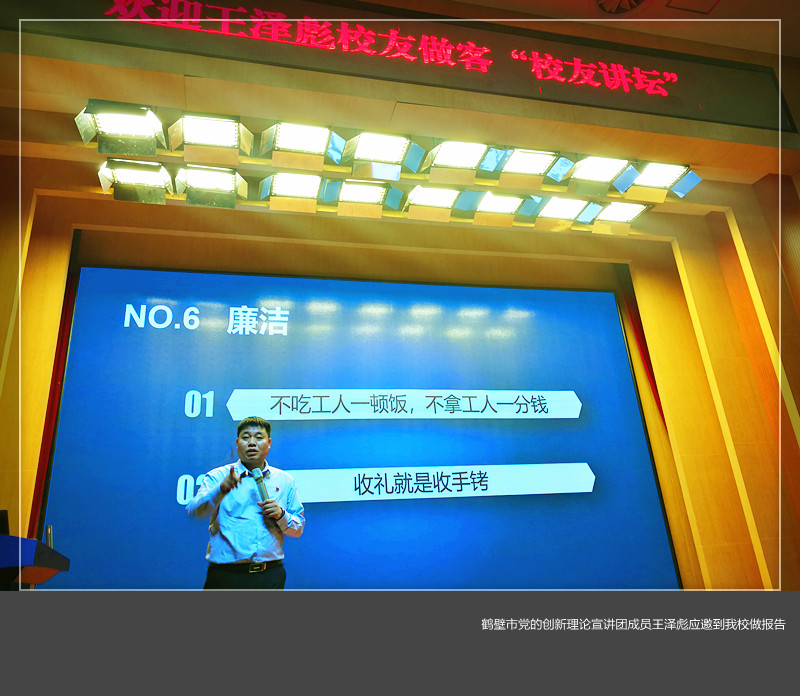 11月22日,鹤壁市“党的创新理论宣讲团”成员、豫鹤同力水泥有限公司生产部党支部书记、生产部部长王泽彪应邀,在王城校区图书馆报告厅做了《弘扬爱国精神,建功立业新时代》的报告,500余名师生聆听了报告。