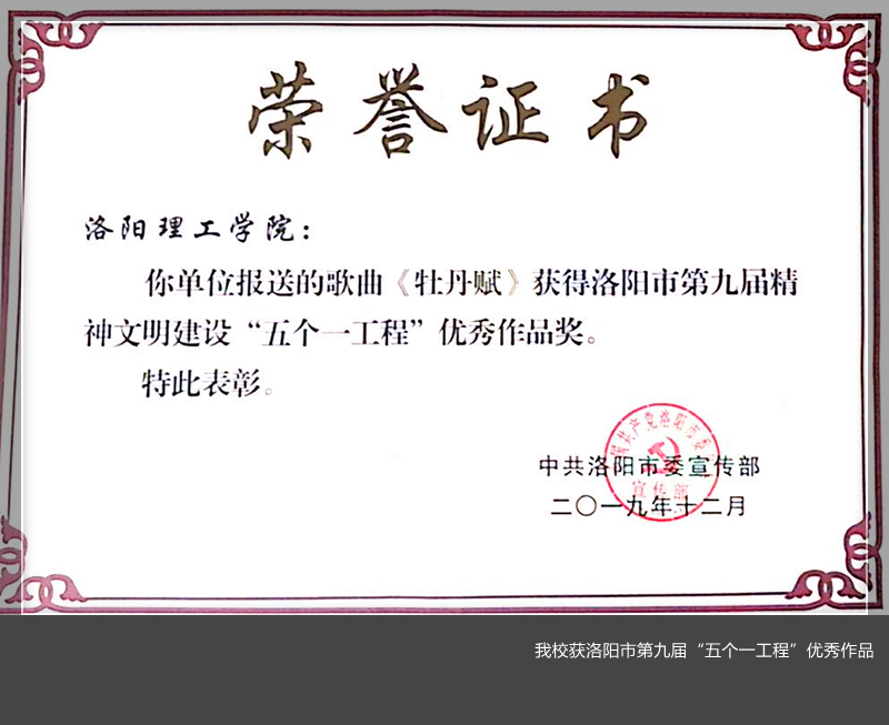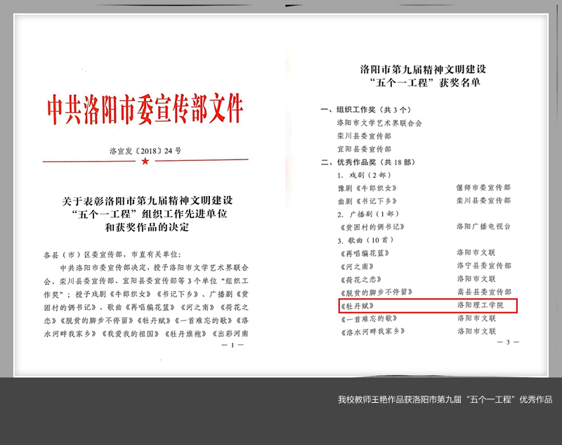 近日,中共洛阳市委宣传部发文《关于表彰洛阳市第九届精神文明建设“五个一工程”组织工作先进单位和获奖作品的决定》,由美高梅娱乐场 报送的,教育科学与音乐美高梅娱乐场 教师王艳演唱的歌曲《牡丹赋》荣获优秀作品奖,全市仅有18部作品获此殊荣。