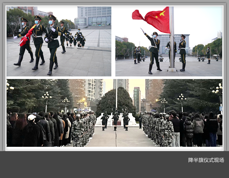 上午7时15分,纪念仪式在肃穆的气氛中正式开始。国旗护卫队队员迈着庄严、整齐的步伐举行了降半旗仪式,以此来表达对南京大屠杀死难者同胞的哀思和悼念,全体人员为南京大屠杀死难者同胞默哀一分钟。