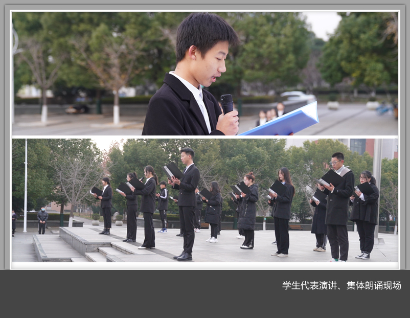 学生代表在国旗下演讲、灯塔研习社成员齐声诵读《国家公祭鼎铭文》,表达了对战争的愤怒和控诉、对遇难者的哀思与悼念,更抒发了对和平生活的美好向往,引起在场师生的强烈共鸣。部分师生在国家公祭网上同步进行了悼念活动。
