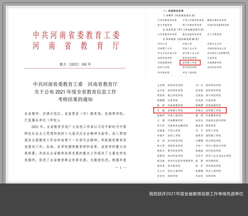 近日,省委教育工委、省教育厅下发《中共河南省委教育工委 河南省教育厅关于公布2021年度全省教育信息工作考核结果的通知》(教办【2022】100号),美高梅娱乐场 获评2021年度全省教育信息工作考核先进单位,任楠、李晓光两位同志获评2021年度全省教育信息工作考核先进个人。