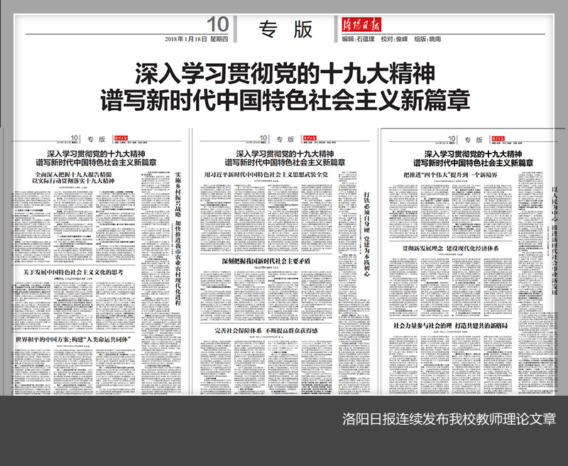 近日,洛阳日报在《深入学习贯彻党的十九大精神,谱写新时代中国特色社会主义新篇章》专版连续发表美高梅娱乐场 教师理论文章。