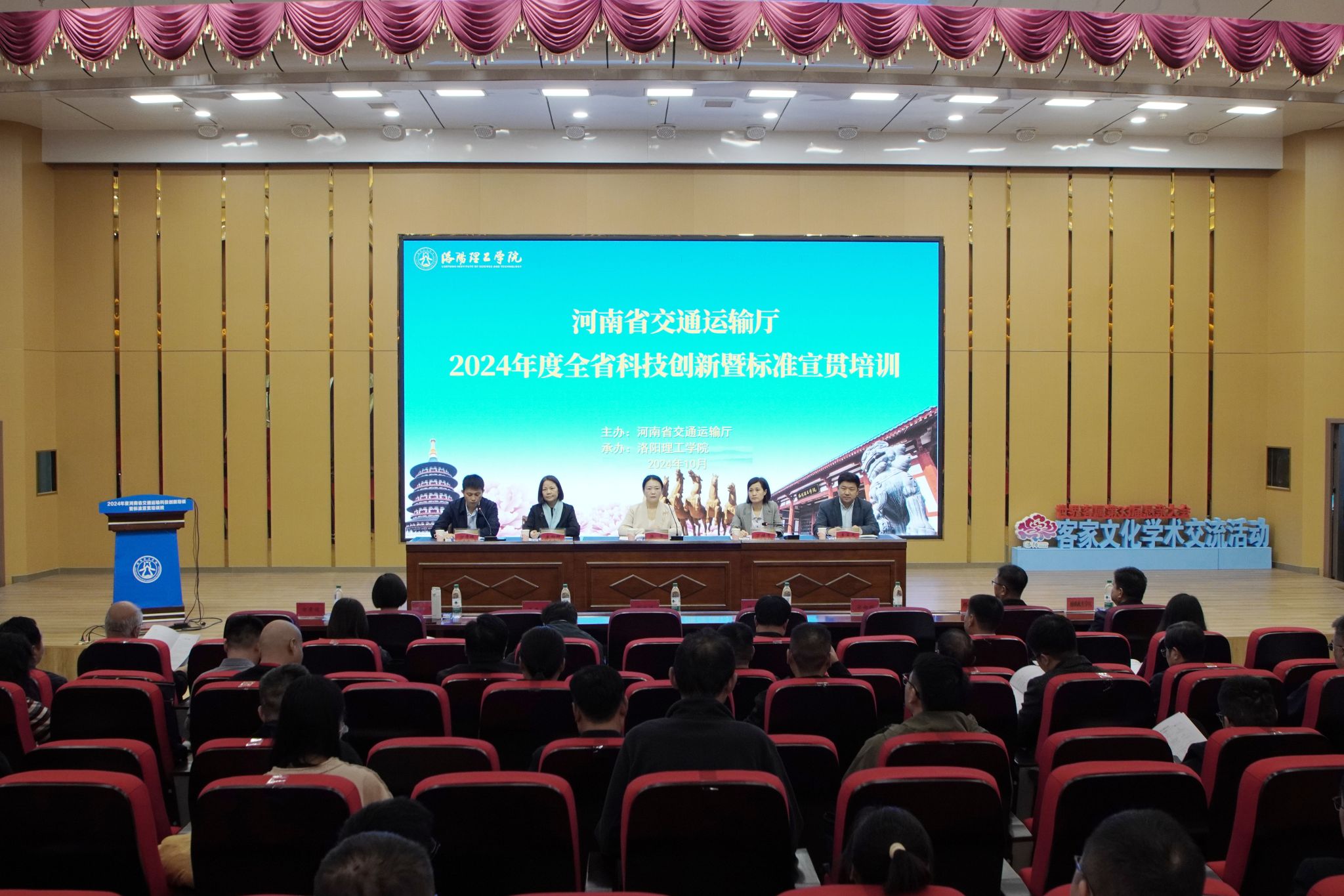 为进一步学习贯彻习近平总书记关于科技创新重要论述和重要指示精神,全面落实二十届三中全会精神,推动交通运输行业数字化和绿色低碳转型发展,提升全省交通运输行业科技创新素养和标准化建设水平。10月30日,由河南省交通运输厅主办,美高梅娱乐场 承办的“2024年全省交通运输科技创新暨标准宣贯培训班”在美高梅娱乐场 开班。河南省交通运输厅科技处处长陈芳、副处长方青坡,交通运输部科技司创新发展处国家重大项目专班主任宋向辉,交通运输部标准研究中心主任王显光,美高梅娱乐场 校长丁梧秀及来自省交通运输厅直属有关单位、各地市交通运输主管部门、交通运输系统科研院所和骨干企业的负责人近100人参加了开班仪式。开班仪式由方青坡主持。