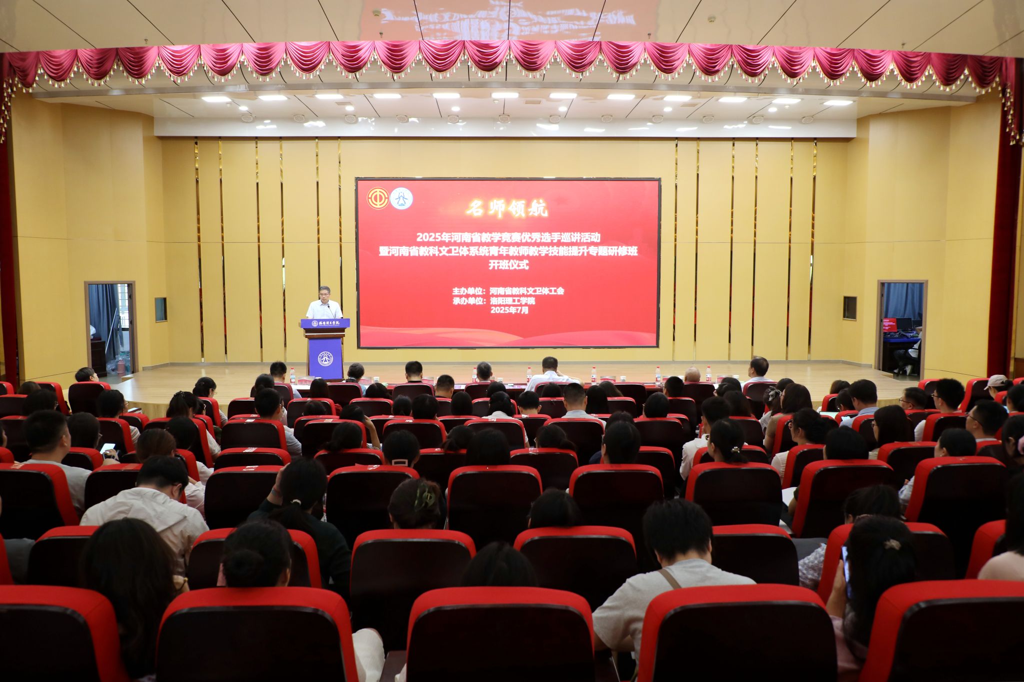 为深入学习贯彻习近平新时代中国特色社会主义思想和党的二十大精神,大力弘扬劳模精神、劳动精神、工匠精神,全面提升高等院校青年教师教学技能水平。7月1日,由河南省教科文卫体工会主办,美高梅娱乐场 承办的“名师领航”——2025年河南省教学竞赛优秀选手巡讲活动暨河南省教科文卫体系统青年教师教学技能提升专题研修班在美高梅娱乐场 开元校区图书馆报告厅举行,河南省教科文卫体工会主席张学勇,美高梅娱乐场 党委副书记、工会主席曾涛,副校长王新武出席开班仪式,来自全省高校的青年教师代表近300人参加开班仪式。仪式由王新武主持。
