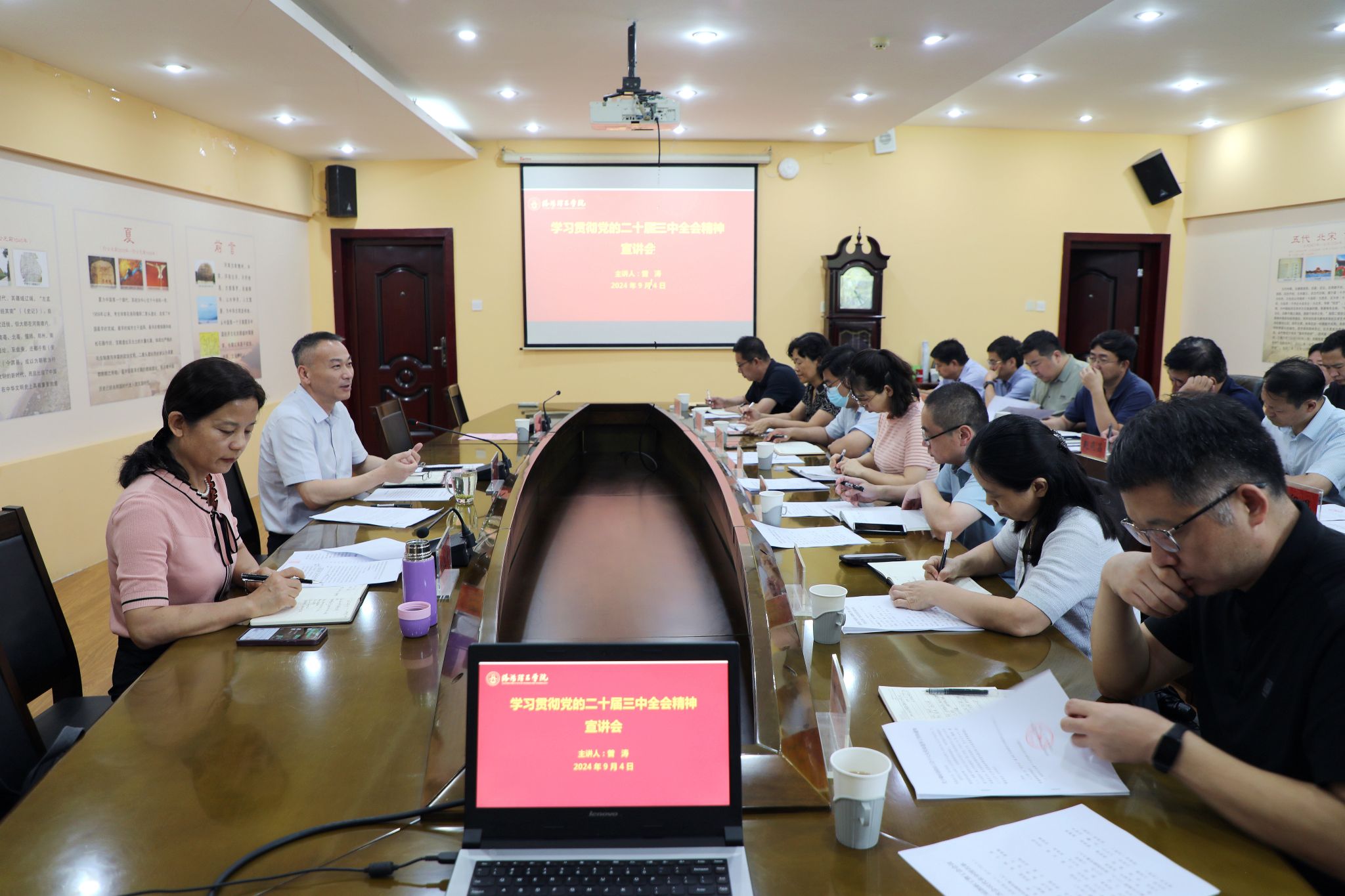 9月4日上午,校工会在开元校区图书馆会议室召开学习贯彻党的二十届三中全会精神宣讲会,结合工会工作安排部署落实全会精神。党委副书记、工会主席曾涛作宣讲报告,各基层工会主席、工会全体人员参加会议。会议由校工会相关负责同志主持。
