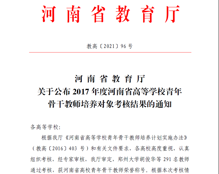 关于公布2016、2017年度河南省高等美高梅娱乐场 青年骨干教师培养对象考核结果的通知