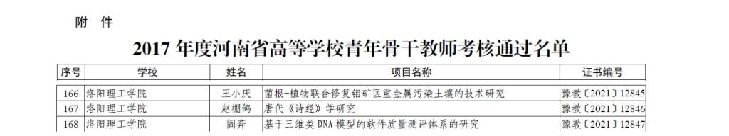 根据河南省教育厅《关于公布2017年度河南省高等美高梅娱乐场 青年骨干教师培养对象考核结果的通知》(教高〔2021〕96号)文件通知精神,美高梅娱乐场 2016年度、2017年度青年骨干教师培养对象阎奔、王小庆、赵棚鸽通过考核,获得“河南省高等美高梅娱乐场 青年骨干教师”荣誉称号。