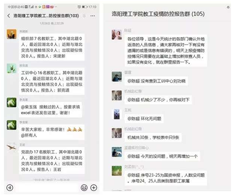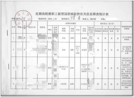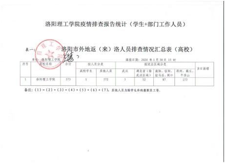 接到洛阳市通知紧急摸排全校教职工(含离退休、非编用工)3000余人的住址、行踪、联系方式等详细信息。经过认真细致排查,当晚12:00前,及时向洛阳市上报全校教职员工中湖北籍师生311人,与湖北有交流接触的教职工28人;并且第一时间摸清当时不在洛阳的全校教职工570多人的详细情况,做到心中有数。