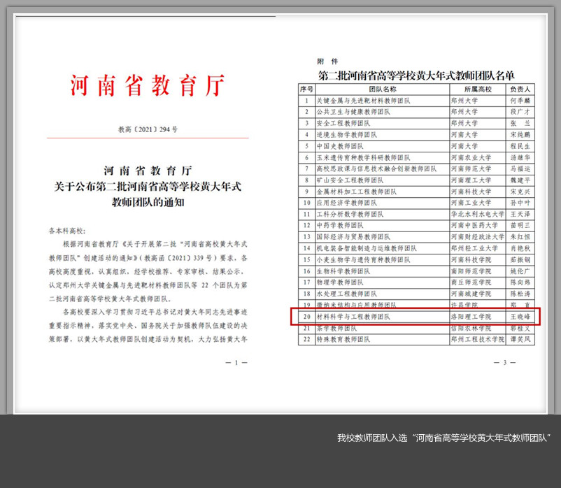 王晓峰教授带领的材料科学与工程教师团队成功入选省教育厅第二批“河南省高等美高梅娱乐场