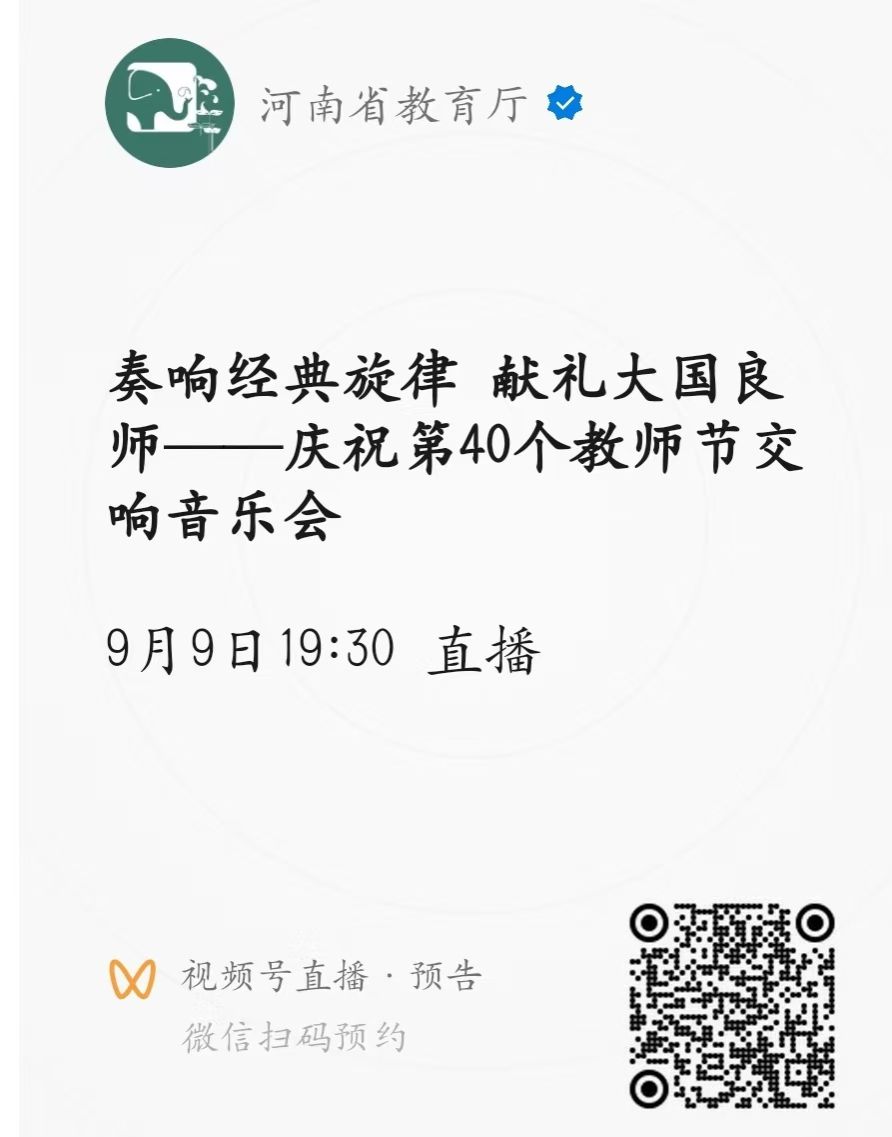 老师可通过“河南省教育厅”微信视频号收看直播。现就网上收看交响音乐会有关事项通知如下: