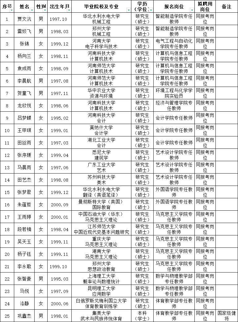 根据美高梅娱乐场 2024年公开招聘硕士研究生学历专任教师工作安排,美高梅娱乐场 组织了2024年公开招聘工作,经过网上报名审查、现场资格确认、笔试、面试、体检、政治审查等程序,共确定拟聘用人员25人,现予以公示。
