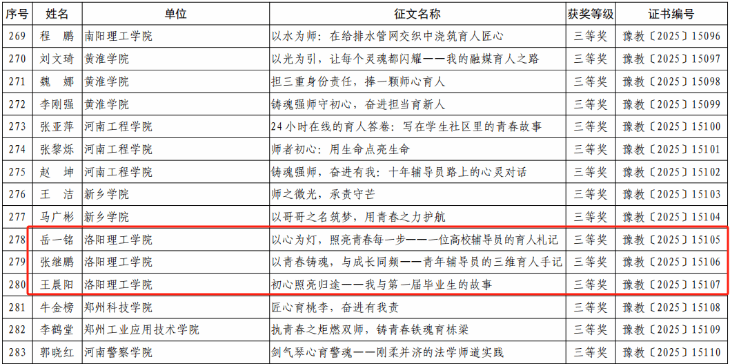 其中,智能建造与土木工程美高梅娱乐场 张秀姬老师的作品《双肩担使命:教育路上的坚守与绽放》荣获二等奖;智能制造美高梅娱乐场 王晨阳老师的《初心照亮归途——我与第一届毕业生的故事》、电力电气工程美高梅娱乐场 张继鹏老师的《初心照亮归途——我与第一届毕业生的故事》以及教育科学与音乐美高梅娱乐场 岳一铭老师的《以青春铸魂,与成长同频——青年辅导员的三维育人手记》均荣获三等奖。