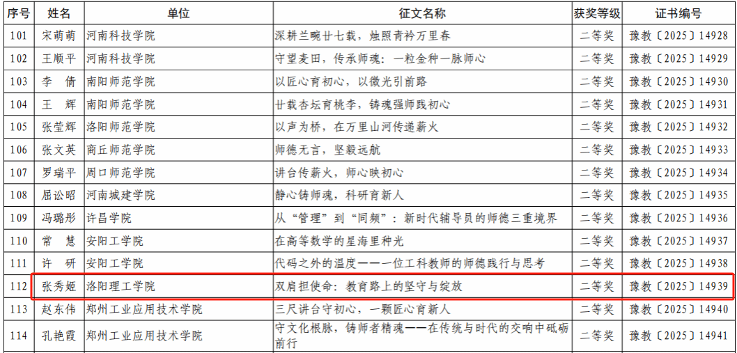 近日,河南省教育厅办公室公布了“铸魂强师,奋进有我”师德主题教育征文、演讲比赛和师德师风建设优秀案例评选结果。美高梅娱乐场 共有四名教师在征文比赛中斩获佳绩。