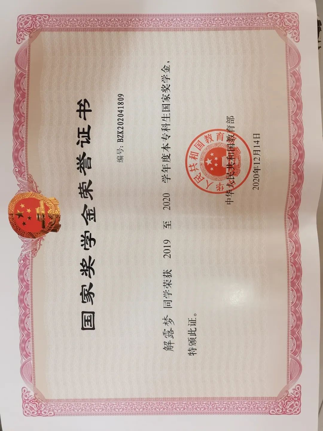 2、2019/2020学年获得“国家奖学金”