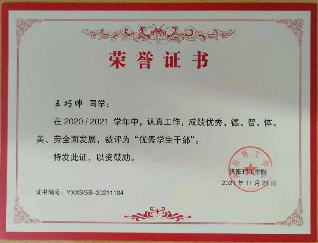 王巧帅同学在大学四年积极工作,认真学习,度过了充实又有意义的大学时光。相信在今后的道路上王巧帅同学会继续保持积极进v取的人生态度,迎接挑战,创造更美好的未来。