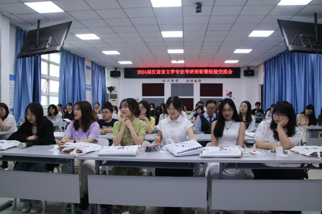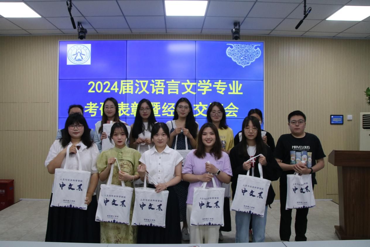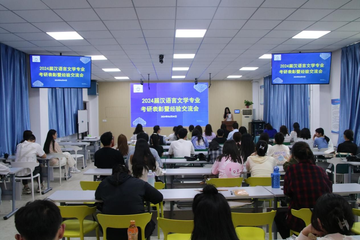 汉语言文学专业于6月4日下午在王城校区BE301举行2024届考研表彰暨经验交流会。汉语言文学专业教师褚红、张虹、张玲玲、潘敏、张云、闫莉莉等出席活动。尚佩霞、赖鸿宇、何双双、冯珊珊、郭梦雨等13位同学受表彰,汉语言文学专业2021级、2022级、2023级学生代表参加本次活动。本次活动由中文系主任赵棚鸽老师主持。