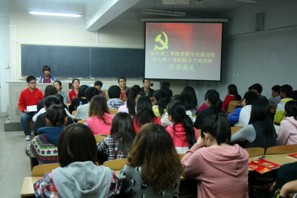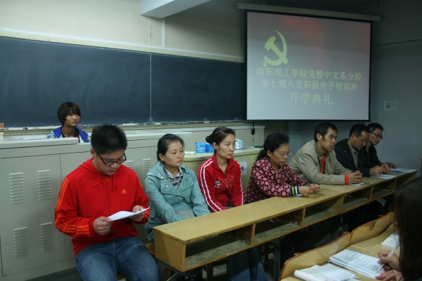 教室举行第七期入党积极分子培训班开学典礼,中文系党总支书记苑成存,副书记张姝,团总支书记耿志强,第七期培训班班主任李勉等出席典礼。
