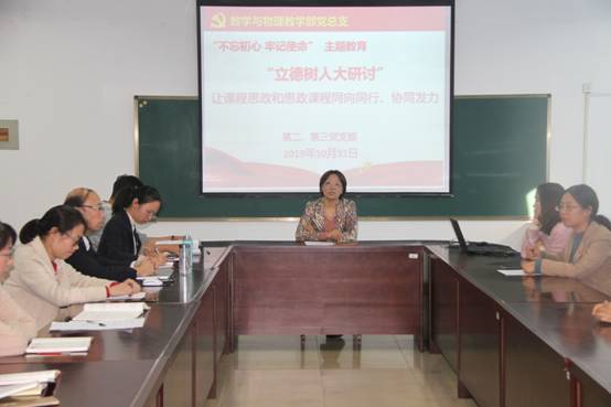 在“不忘初心、牢记使命”主题教育中开展“立德树人”大研讨活动方案》(党发[2019]68号)文件精神,2019年 10月31日下午,数学与物理教学部各党支部以“什么样的老师才是人民满意的好老师”、“让课程思政和思政课程同向同行、协同发力“为主题开展了“立德树人大研讨”活动。