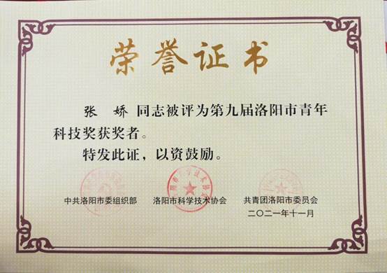喜报:我部教师张娇荣获第九届洛阳市青年科技奖