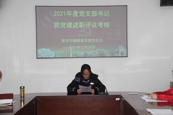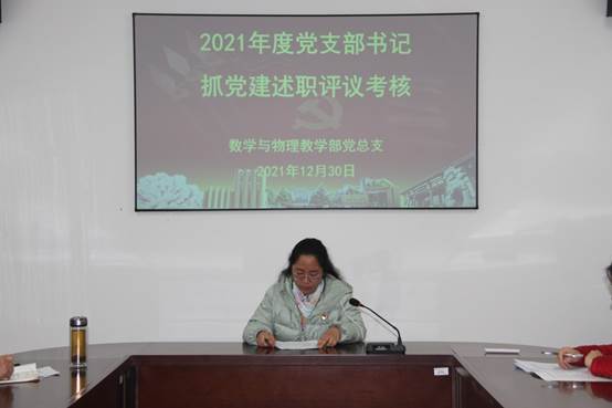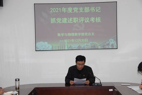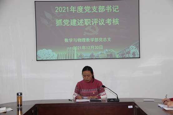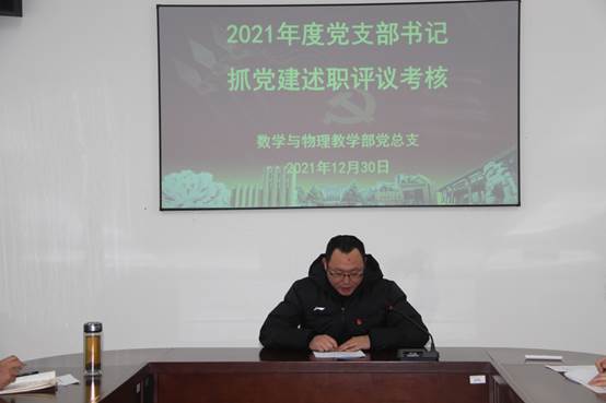 为深入贯彻习近平新时代中国特色社会主义思想,全面贯彻党的十九大和十九届二中、三中、四中、五中、六中全会精神,进一步落实管党治党政治责任,不断强化“答卷意识”、保持“赶考”状态,深入实施强基固本工程,2021年12月30日下午,数学与物理教学部党总支进行了教工党支部书记抓党建述职评议考核和党支部工作考核。会议由党总支书记高辉主持,数理部全体党总支委员及党员代表参加。