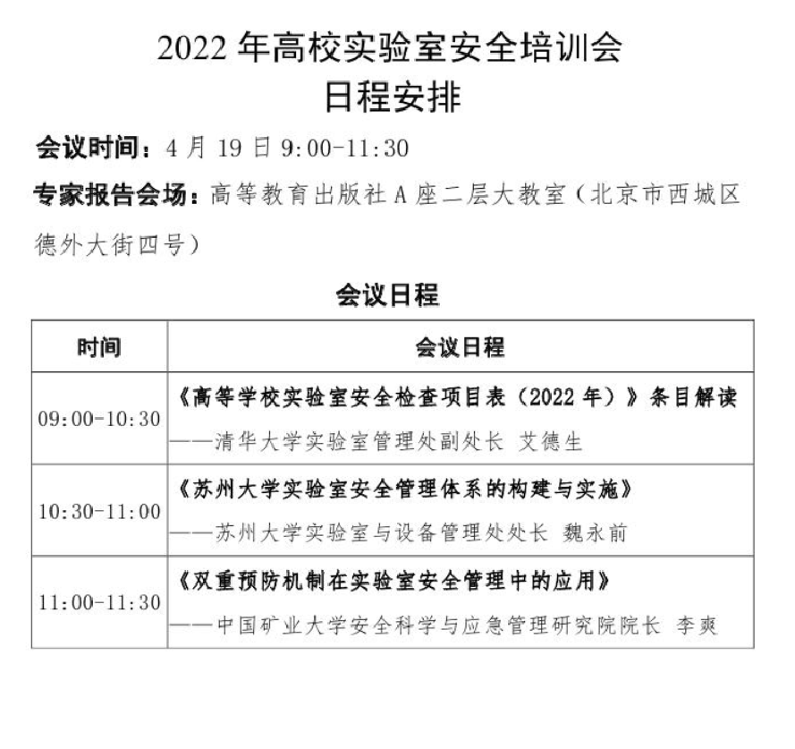 实验室安全检查工作的通知》(教发厅函〔2022〕11号)文件部署,教育部科学技术与信息化司、高等教育司定于2022年4月19日9:00-12:10以线上形式组织召开“2022年高校实验室安全培训会”。会议将邀请专家对《高等美高梅娱乐场