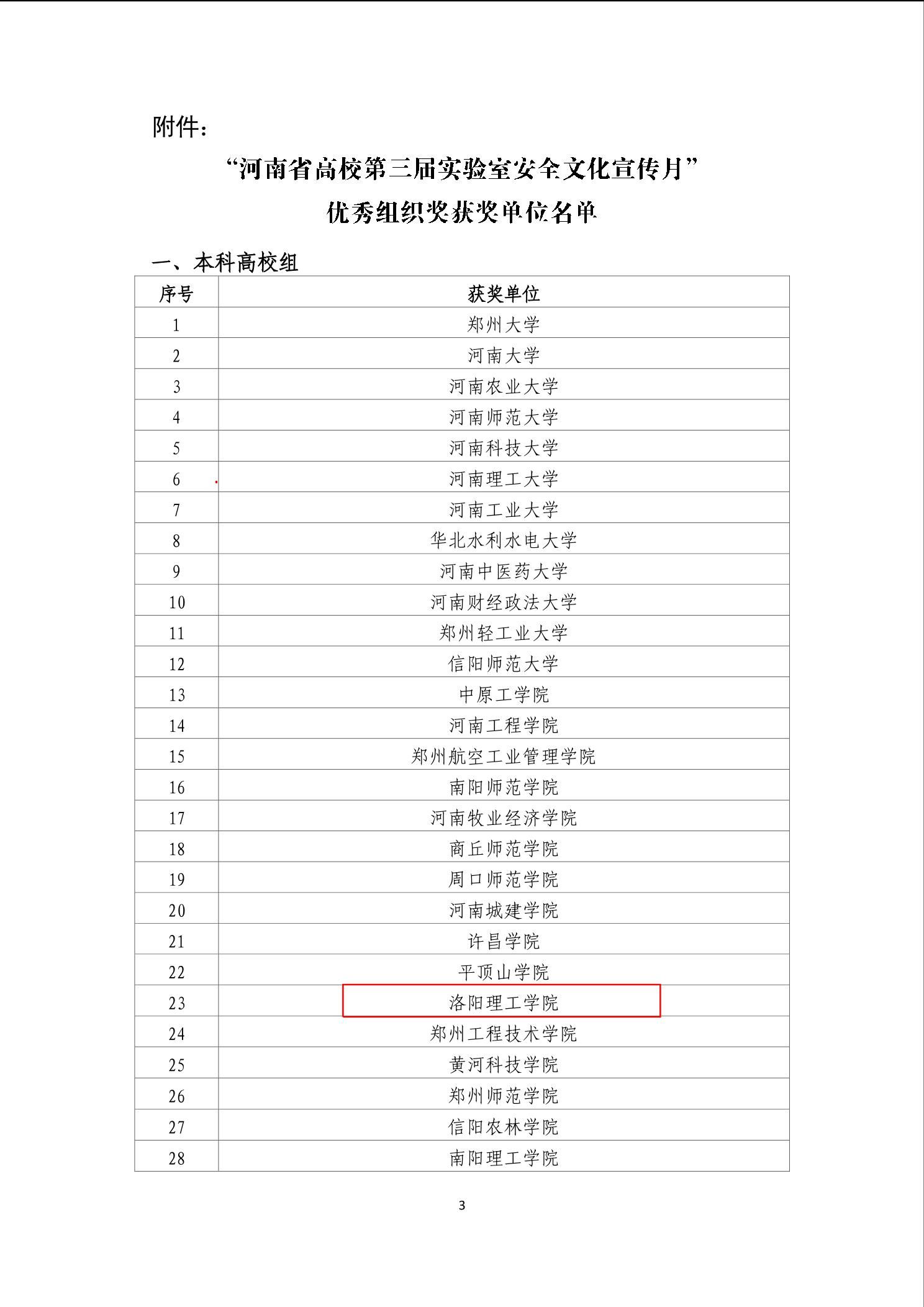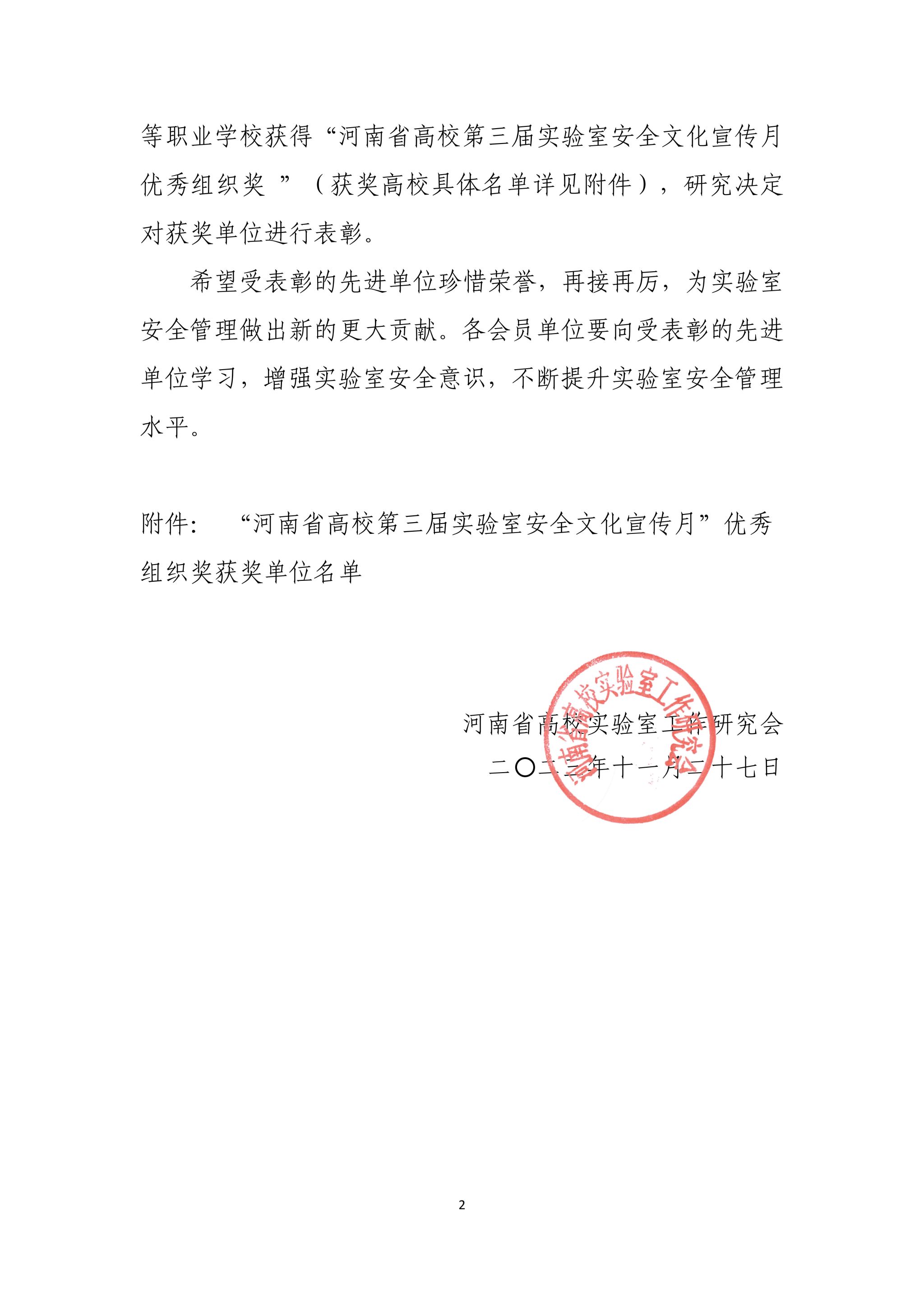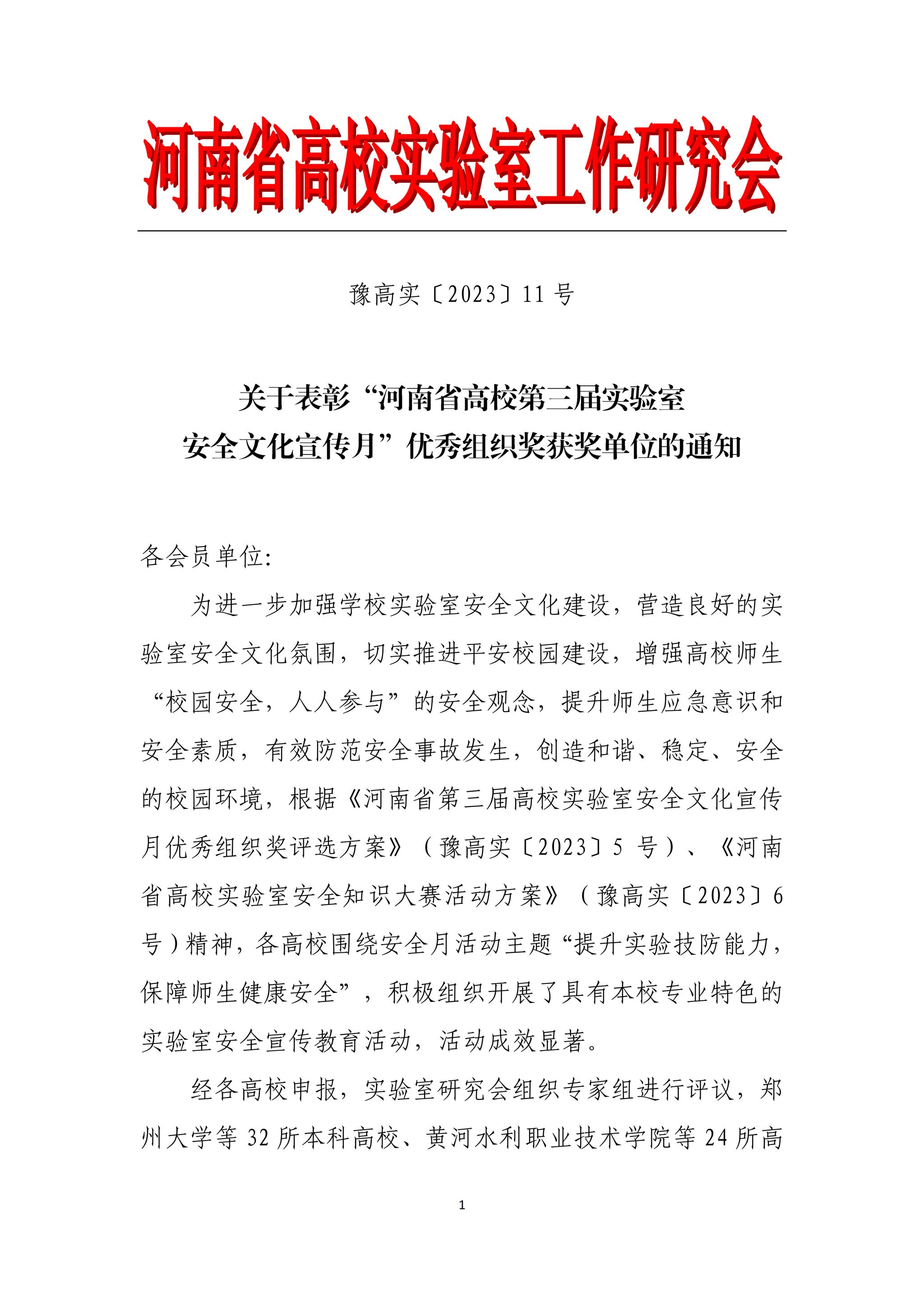 11月30日,河南省高校实验室工作研究会发布了《关于表彰“河南省高校第三届实验室安全文化宣传月优秀组织奖”获奖单位的通知》(豫高实[2023]11号),美高梅娱乐场