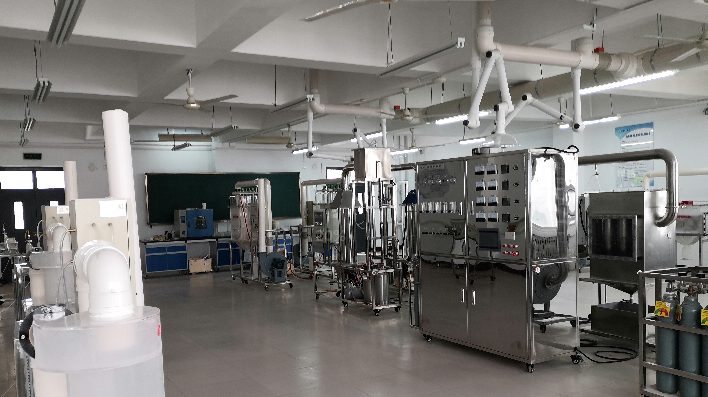 教学实训室,实训内容包括化工管路拆装、多效蒸发与结晶生产实训、乙酸乙酯合成生产实习、