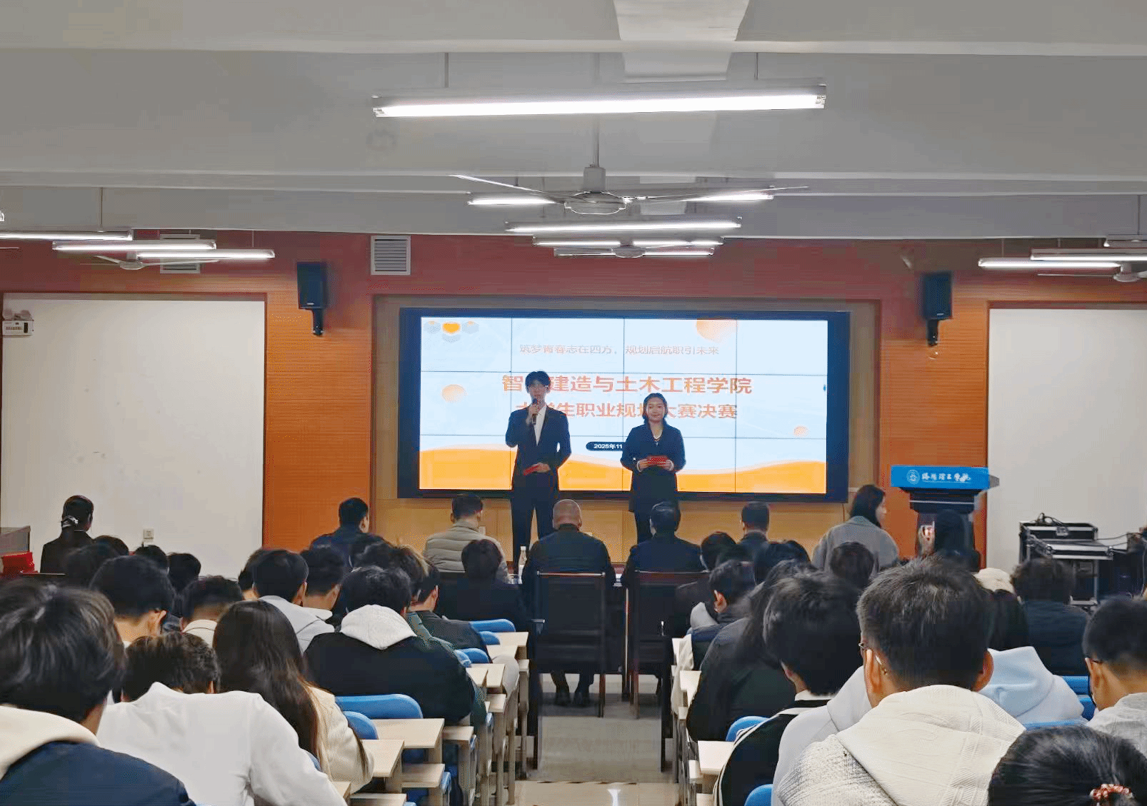 党委书记毛伟伟、党委副书记杨桢,土木工程(中外合作办学)专业系主任赵建建、智能建造专业系主任陈易飞,以及学工办副主任邵悠然、团委副书记李娈启、就业指导办公室副主任郑博担任评委,全院各年级参赛选手及学生代表共同见证这场青春与梦想的盛会。