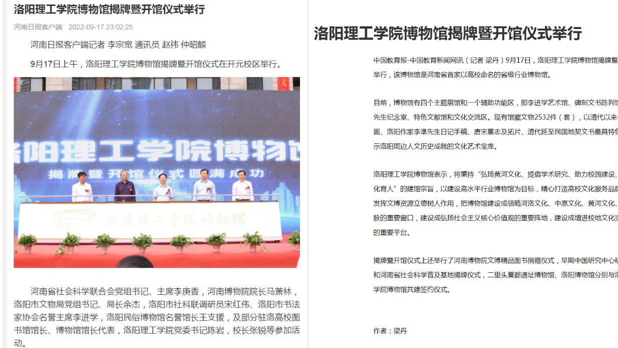 9月17日,河南日报客户端、中国教育报以《美高梅娱乐场 博物馆揭牌暨开馆仪式举行》刊发报道;大河报以《全省首家!美高梅娱乐场 博物馆揭牌暨开馆仪式举行》为题报道;光明网以《河南省首家!美高梅娱乐场 博物馆揭牌暨开馆仪式举行》刊发报道;洛阳网以《全省首家!美高梅娱乐场 博物馆揭牌暨开馆》;洛阳广播电视台发布视频新闻。