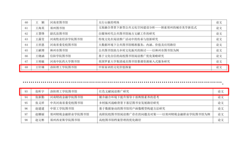 图书馆副馆长张昕宇的论文《红色文献阅读推广研究》,王针臻的论文《中原家训的文化价值探索》荣获一等奖。