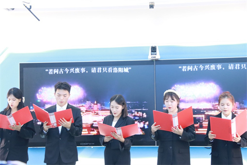 伴随着激荡人心的音乐,金话筒社的同学们为大家朗诵谭杰先生的《洛阳赋》,辞赋慷慨铿锵,朗诵激情昂扬,在乐声与光影交错配合下,听众们如身临其境,最后全场齐诵:“呜呼!悠悠哉河洛,煌煌哉文明!巍巍哉中居,赫赫哉王城……”全场师生沉浸于诗词意境之中,深切体会到河洛诗境里的家国情怀。