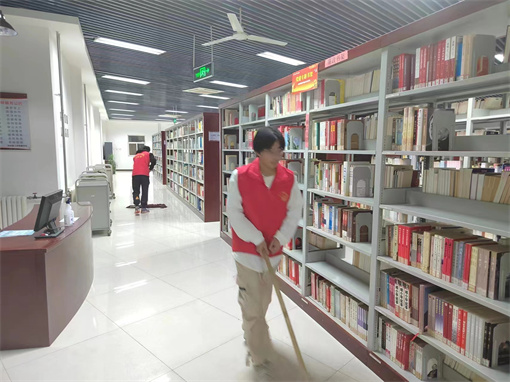 图书馆值守老师和学生志愿者们集合在一起,分工协作,清洁地面、廊道、扶手、楼梯、桌椅、书架等一丝不苟,图书馆舍学习环境焕然一新。老师和同学们纷纷表示,要继续发扬“互相帮助、助人自助、无私奉献、不求回报”志愿者精神,齐心协力为入馆学习的同学们提供更加轻松舒适、干净整洁的学习环境。