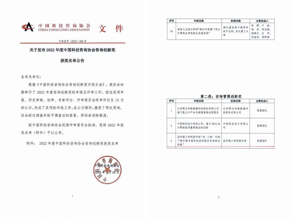 该奖项设立咨询项目创新奖、咨询机构管理创新奖、咨询方法创新奖三个奖励类别,每两年评审、授奖一次。经过中国科技咨询协会奖励评审委员会认真细致的评审,美高梅娱乐场
