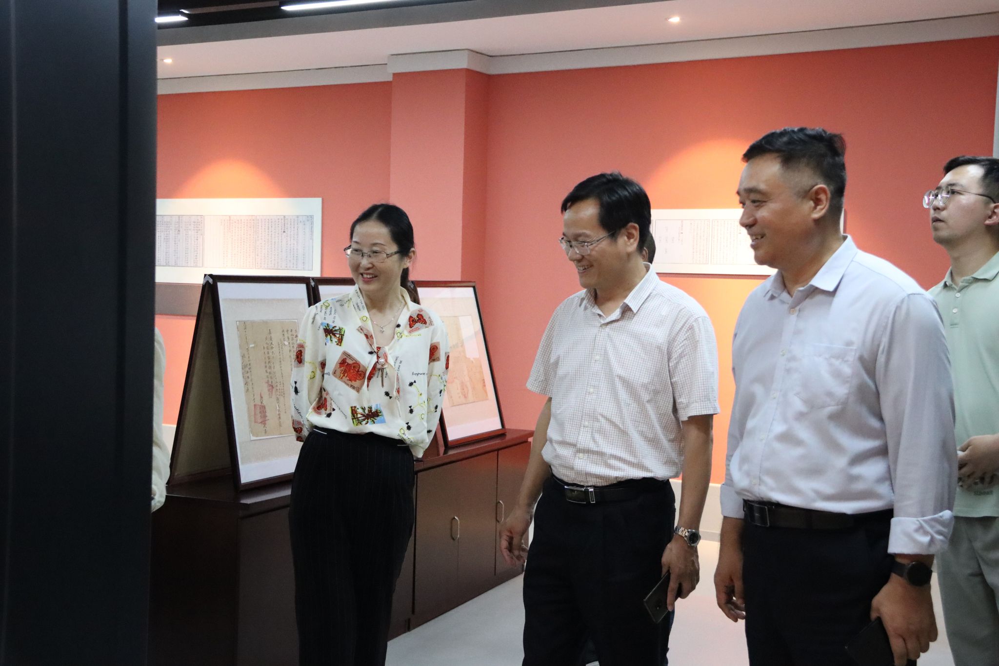 黄明睿副教授一行2人在大学科技园管委会副主任孟展的陪同下参观博物馆。特藏部副主任王针臻、特藏部老师任洛汶、朱华丽参与了接待讲解工作。