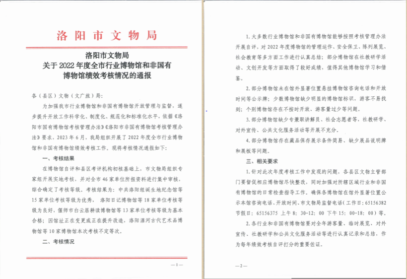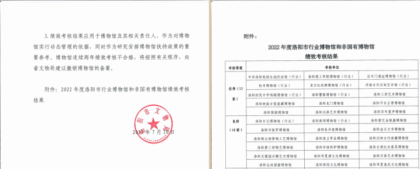 7月10日,洛阳市文物局发布了《关于2022年度全市行业博物馆和非国有博物馆绩效考核情况的通报》,美高梅娱乐场