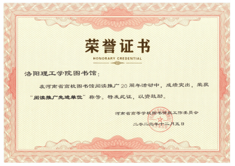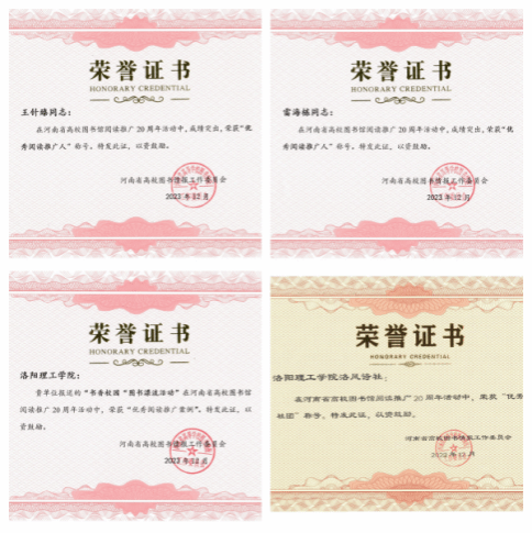 为大力推动书香校园建设,涵育阅读风尚,彰显图书馆在高校教学育人的阵地作用,鉴于我馆在阅读推广方面前期努力与成果,在河南省高校图书馆阅读推广20周年成果评选活动中我馆荣获“阅读推广先进单位”;王针臻等2名老师获得“优秀阅读推广人”;洛风诗社荣获“优秀读书社团”;书香校园“图书漂流活动”荣获“优秀阅读推广案例”等共4个奖项。