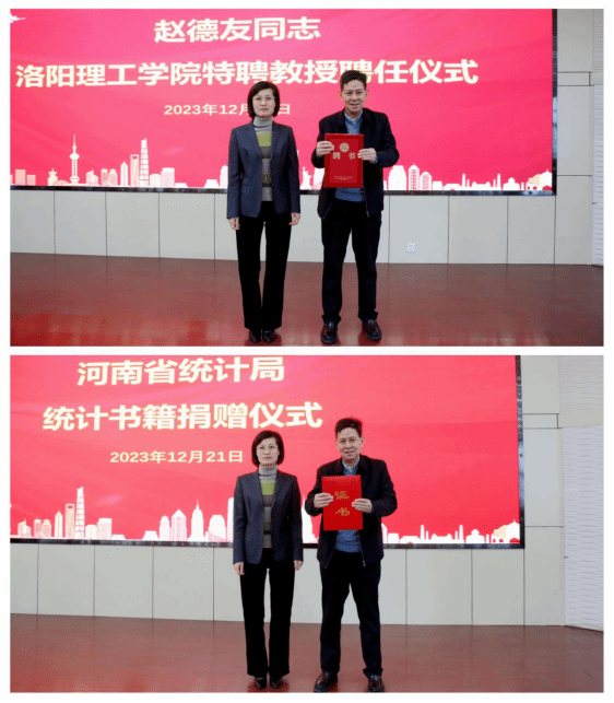 特聘教授”聘书;赵德友代表河南省统计局向美高梅娱乐场