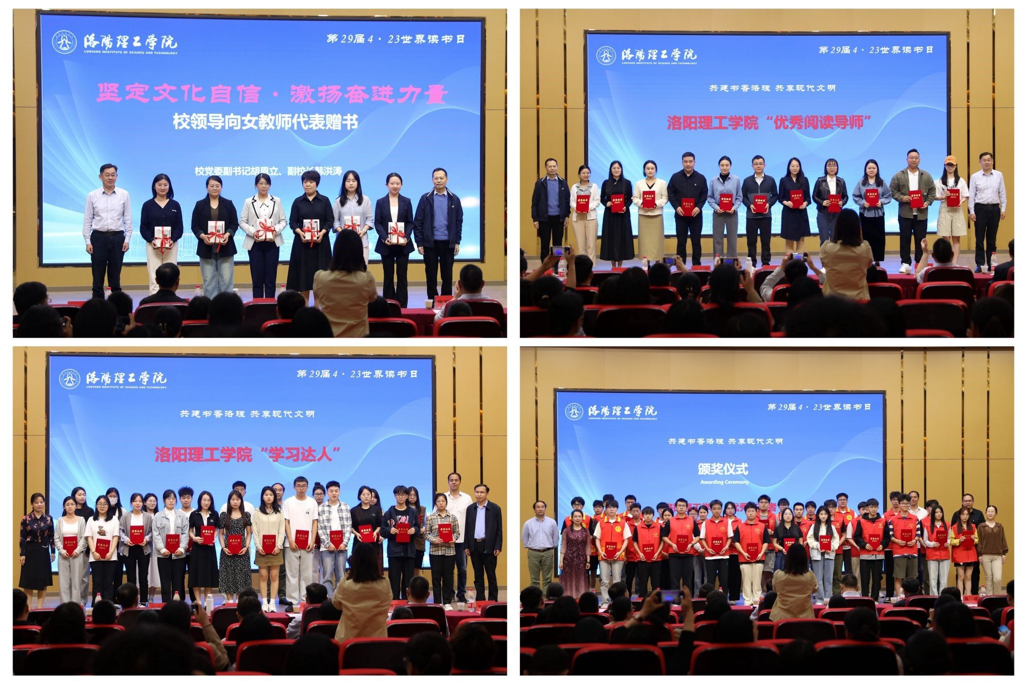 本次活动表彰了2023年度暨2024年第一季度“阅读之星”18人,在馆勤奋学习的“学习达人”36人,为阅读推广活动无私奉献的“优秀志愿者”60人,引导学生积极阅读的“优秀阅读导师”14人。校领导向女教职工代表赠送了优秀书籍。